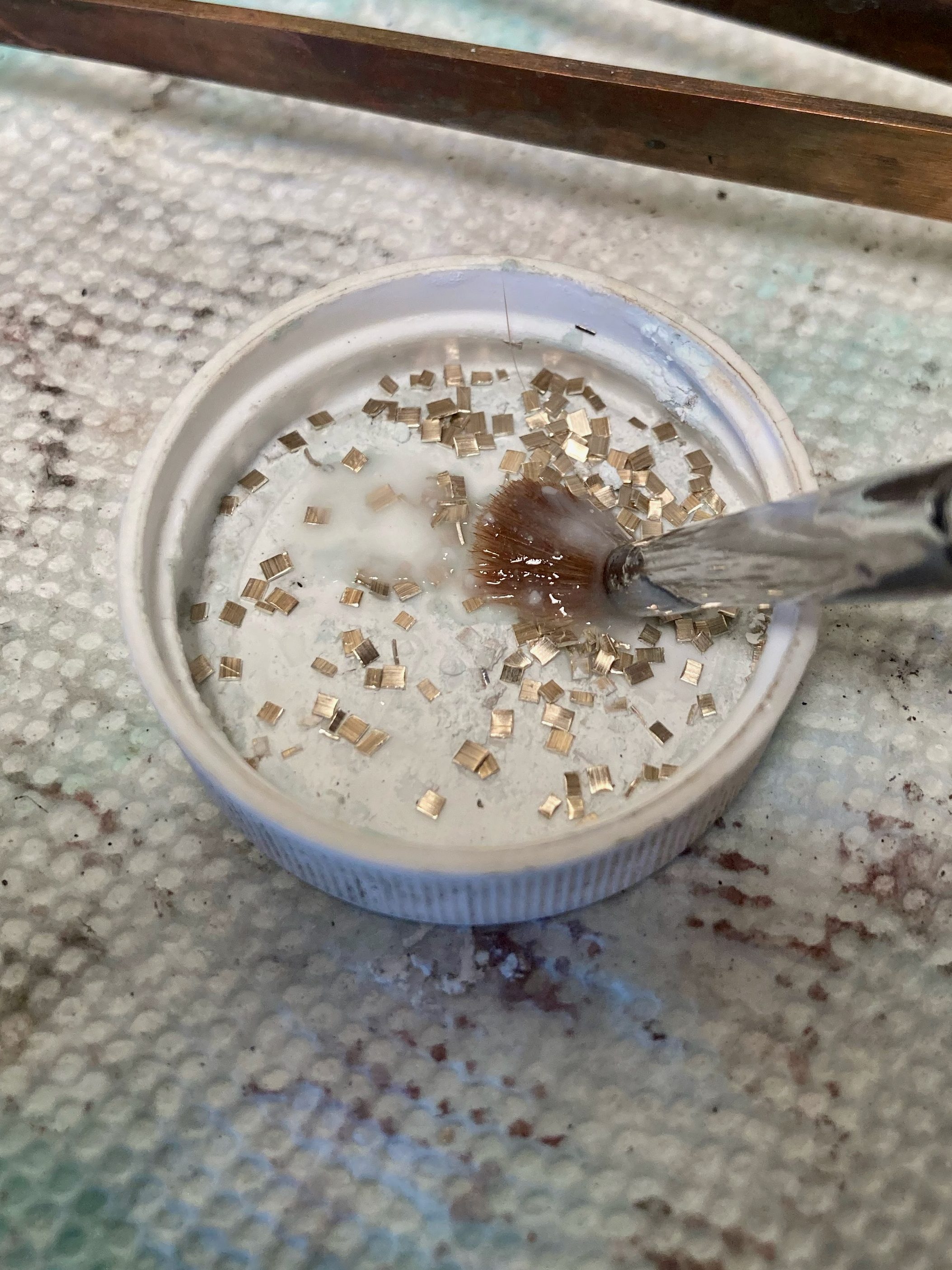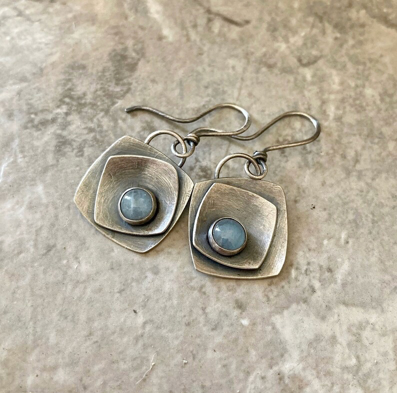 TIPS: The first photo shows aquamarine earrings with soldered layers. To create the pieces of solder, I use scissors to cut tiny pieces from a flat sheet. I cut strips about ¼ inch long on the sheet and then cut across the sheet to create the tiny pieces. I try to cut them into the little container by covering the cross cuts with my finger to keep them from flying around. Some are larger and some are smaller which is a good outcome. When soldering wire, I use smaller pieces. When soldering a bezel onto a flat base, I use larger pieces. I then paint them with flux to keep them from tarnishing. You need clean solder and surfaces to get the solder to flow. If the solder is dry, I spray the little cup with water and this allows easy pick up with the tweezers to place the solder. I have 3 cups to hold easy, medium and hard solders.