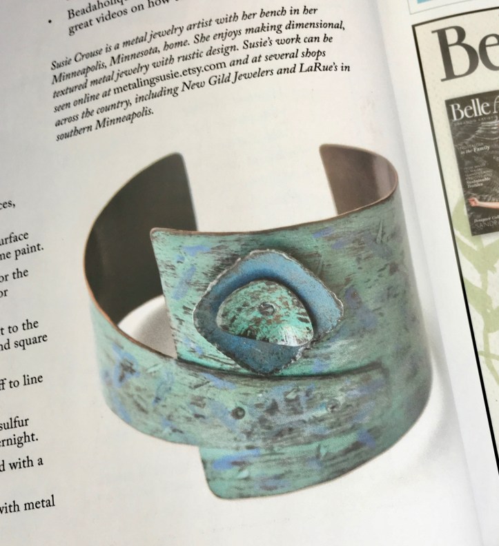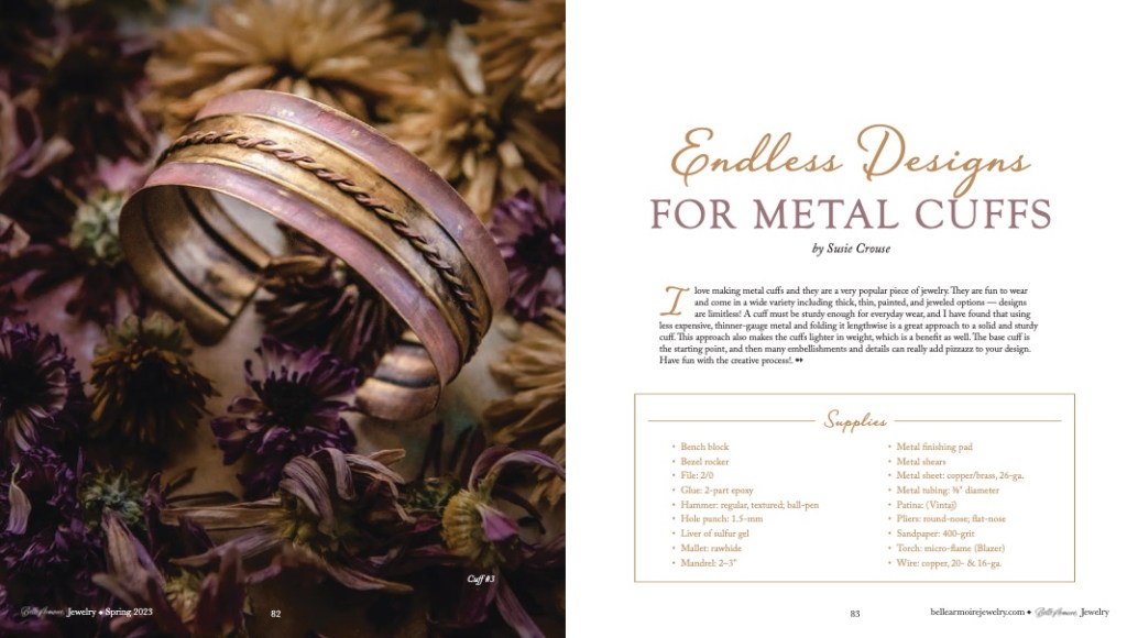 “Endless Designs for Metal Cuffs” by Metaling Susie in March 2023. Grateful to be recognized for my work in Belle Armoire magazine. Thank you!
